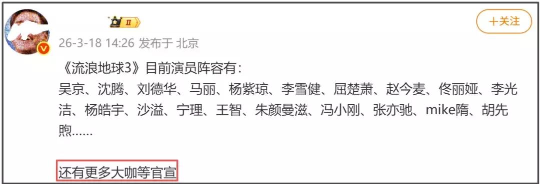 其实,冯小刚的加入只能说是引爆争议的导火索。自从《流浪地球3》官宣一个又一个大咖明星的加盟之后,观众的期待值就越来越低。据不完全统计,该片已经先后官宣了喜剧演员沈腾和马丽、奥斯卡影后杨紫琼和实力派演员宁理等等。明星越塞越多,影片定位越来越让人捉摸不透。